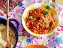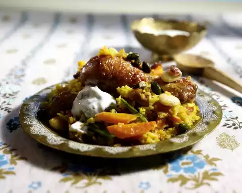 Add garlic, spring onions, raisins and pistachios. Season with salt, pepper, cardamom, cinnamon and saffron. Deglaze with 1 litre stock, simmer for 5 minutes. Add 1/4 litre of stock, spread the legs on top.
