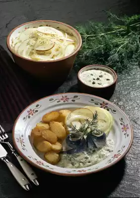 Mix the marinade with the apples and onions. Cover and leave to stand for at least 1/2 hour. Season to taste again before serving. For the sauce, wash the dill and chop, except for 4 flags for garnishing.