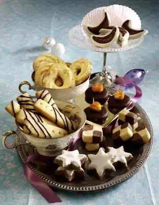 Roll out both doughs to a rectangle (approx. 4 cm wide, approx. 2 cm thick) on a work surface dusted with flour and halve lengthwise. Put 2 light and 2 dark strands of dough on top of each other, press firmly and chill for about 30 minutes. Cut the dough into approx. 1 cm thick pieces and place on 2 baking trays lined with baking paper. Bake the trays one after the other in a preheated oven (electric cooker: 200 °C/ convection oven: 175 °C/ gas: level 3) for 8-10 minutes. Let the biscuits cool down on a cake rack