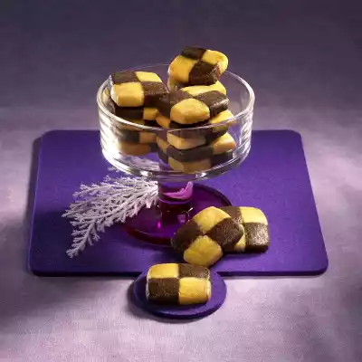 Put 2 light and 2 dark strips together like a chessboard. Chill for 1-2 hours. Cut into approx. 30 slices and place on 2 baking trays lined with baking paper. Bake one after the other in a preheated oven (electric cooker: 200 °C/ convection oven: 175 °C/ gas: level 3) for about 12 minutes. Whisk egg yolk and cream. Take out the pastry and immediately brush with the whisked egg yolk, allow to cool