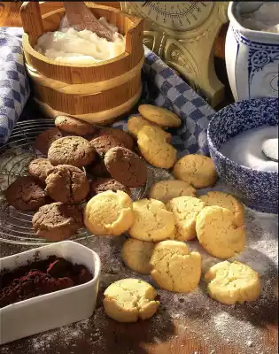 Beat the soft lard, butter, sugar and vanillin sugar with the whisk of a hand mixer until foamy. Knead in the flour and ammonium bicarbonate of hartshorn. Halve the dough and knead the cocoa under one half. Wrap dough in foil and put in a cool place for about 3 hours. Form walnut-sized balls from the dough, place them on 2 baking trays lined with baking paper and press them slightly flat with a teaspoon. Bake one after the other in a preheated oven (electric: 200 °C/ gas: level 3) for about 15 minutes. Results in approx. 80 pieces