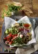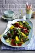 For the salad, peel and chop the onions. Peel the mango. Cut the flesh into strips from the stone and dice finely. Wash and dice the tomatoes. Clean, wash and shake spinach dry.