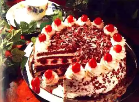 Spread half of the cherry mixture on the cream of the bottom cake layer and place the second layer on top. Cover the second cake layer with cream and thickened cherries and place the third layer on top.