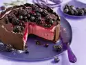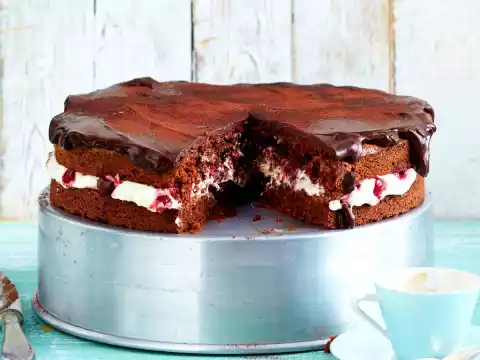 Cut the cooled cake in half horizontally. Spread 200 g cream on the bottom cake layer. Spread the cherries on top. Cover with the upper cake layer and press down lightly. Spread the chocolate icing with a pallet or knife.