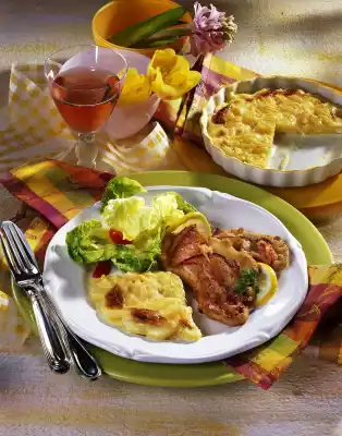 Sprinkle with cheese and cook in the preheated oven (electric cooker: 200 °C/ gas: level 3) for about 45 minutes. In the meantime, wash the cutlets, dab dry and tap flatter. Fasten 1 slice of ham with 1 small wooden stick. One after the other, turn lightly in flour, whisked egg and breadcrumbs. Shortly before serving, fry in approx. 3 tablespoons of hot oil for approx. 2 minutes on each side. Season with a few dashes of lemon juice and pepper. For the salad, clean and wash lettuce hearts. Loosen the leaves slightly and place 1 heart on each plate. Wash the tomatoes and cut them into slices. Peel and finely chop the onion. Whip vinegar, remaining oil and onion.