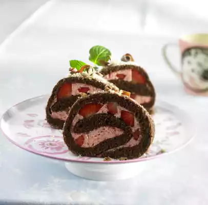 Cut the 200 g into small pieces. Puree the remaining strawberries, lemon juice and 30 g sugar. Whip cream and 1 sachet of vanilla sugar until stiff. Squeeze the gelatine, dissolve lukewarm and stir into the pureed strawberries. Allow to draw a little, fold in the cream. Spread the sponge plate first with jam, then with the strawberry cream. Sprinkle with strawberry pieces. Roll up the sponge cake using the tea towel. Chill for 1-2 hours. For decoration, wash mint and pluck leaves. Puree the mint and 2 tablespoons of sugar in the Moulinette. Remove the chocolate slicer from the chocolate bars with the peeler. Cut the sponge roll into pieces. Decorate with mint sugar and leaves and chocolate rolls