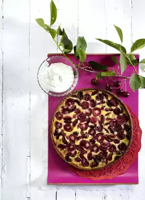 Briefly whisk cream, sugar, vanilla sugar, 3 eggs, 1 egg yolk and kirsch. Sift the starch and stir in. Take the tart base out of the oven. Pour the liquid icing over the tart and spread the cherries on top.