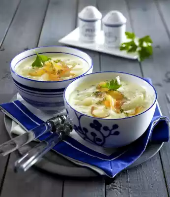 Onion peel, halve and finely dice. Heat butter in a pot. Fry diced onion in it. Add stock, bring to the boil. Drain black salsifies. Add potato and black salsify pieces to the stock and simmer for about 25 minutes. Remove some pieces of black salsify from the stock with a skimmer and set aside