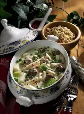 Bring to the boil. Add leek, black salsify and peas and cook for about 10 minutes at medium heat. Add the meatballs and warm up as well. Season ragout with salt, pepper and nutmeg. Pour into a terrine and sprinkle with crushed pink pepper.