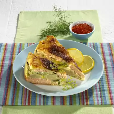 Whisk eggs and milk, stir into the sauce. Grease a well closing, small springform pan (22 cm Ø). Spread half of the fish on the bottom, spread some sauce on top. Alternately spread leek, black salsify, dill, some sauce, remaining fish and remaining sauce. Cook in the preheated oven (electric cooker: 200 °C/ convection oven: 175 °C/ gas: level 3) for about 30 minutes. Allow to cool slightly, remove from the mould and serve in portions garnished with lemon and dill flowers