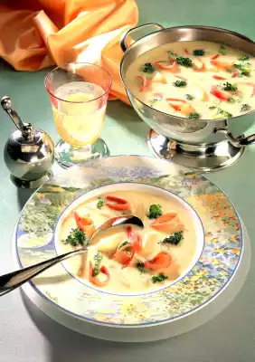 Deglaze with the stock and bring to the boil while stirring. Refine with cream. Season to taste with salt, pepper and nutmeg. Add the vegetables to the soup and warm up. Cut salmon ham into strips and add to the soup.
