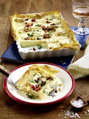 In the meantime, chop the nuts coarsely and roast them in a pan without fat until golden brown. Let them cool down on a flat plate. Remove the tart from the oven. Sprinkle with walnut kernels, remaining bacon and parsley.