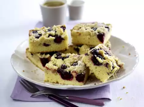 Stir in the eggs one by one. Mix 400 g flour and baking powder and stir in alternately with the yoghurt. Spread the dough on a greased and floured baking tray (32 x 39 cm) and cover with berries. Finally, sprinkle with crumbles and bake in the middle of the preheated oven (electric range: 175 °C/ convection oven: 150 °C/ gas: level 2) for 35-45 minutes. Dust the cake with icing sugar