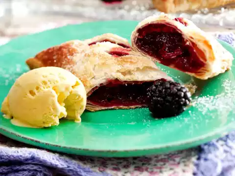 Spread the edges of the puff pastry sheets with a little milk. Spread some blackberry filling on one half of each plate, leaving a 1 cm wide edge. Cut the other half of the pastry several times diagonally with a knife, but do not cut the edge.