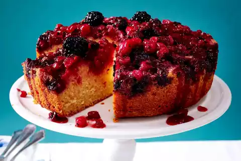 Take the cake out of the oven and let it cool down for about 15 minutes, then turn it out onto a cake plate and let it cool down. Warm up the jelly a little and stir until smooth. Mix the remaining blackberries and currants with the jelly and place on the cake before serving. Whipped cream tastes good with it.