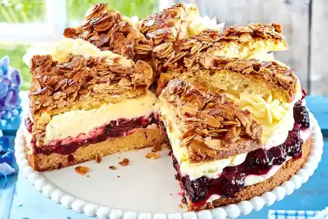 Cut the cake lid into about 12 cake pieces. Spread half of the remaining vanilla cream on the compote, fill the rest of the vanilla cream into a piping bag with a large star-shaped spout and squirt 12 strips in a star shape onto the cake. Place the cake lids diagonally on the cream strips. Serve the remaining pieces with it.