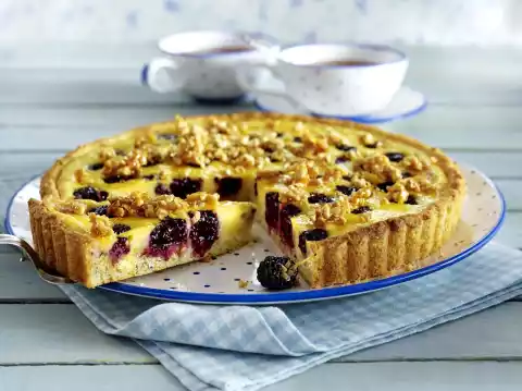 Bake in the preheated oven (electric cooker: 200 °C/ convection oven: 175 °C/ gas: level 3) for 35-40 minutes. In the meantime, melt 60 g sugar in a pan until golden brown. Stir in almonds. Spread almond paste thinly on aluminium foil and let it cool down. Remove the tart from the oven, place it on a cake rack and let it cool down. Coarsely crumble the almond brittle and sprinkle over the cake