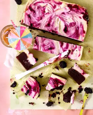 In the meantime, mix cream cheese, sugar and starch. Wash the blackberries and dab dry. Finely puree the blackberries with a hand blender. Remove the mould from the oven, spread the cheese mixture on top and swirl the blackberries on the surface with a fork.