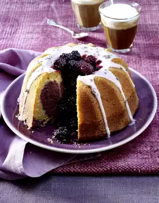 Cut the dough in half. Stir pureed berries and 20 g flour into one half. Pour the light, then dark dough into a greased, flour-sprinkled ring cake tin (approx. 2.5 litres capacity) and bake in a preheated oven (electric range: 175 °C/ convection oven: 150 °C/ gas: see