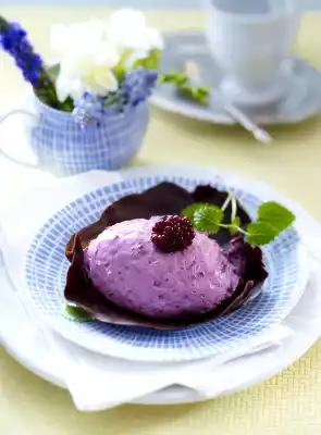 For the mousse, soak gelatine in cold water. Sort the blackberries, wash and pat dry. Puree the blackberries and pass through a sieve. Stir in yoghurt and sugar. Squeeze out the gelatine and dissolve in a small pot at very low heat.