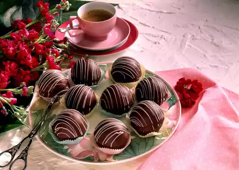 Crush the couverture and melt in a water bath. Let it cool down. Separate the eggs. Beat the egg whites until stiff, then add 75 g sugar. Add the egg yolks bit by bit. Sift flour, starch and baking powder over the egg yolks and fold in with a whisk.