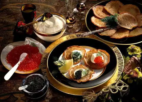 Serve the blini hot, possibly brushing with the rest of the hot butter. Serve caviar and sour cream extra rich and garnished with dill. Makes 25 pieces.