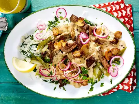 Peel onion and cut into thin rings. Add the steak strips again. Season sauce with salt, pepper and lemon juice. Arrange rice and bœuf stroganoff with onion rings.