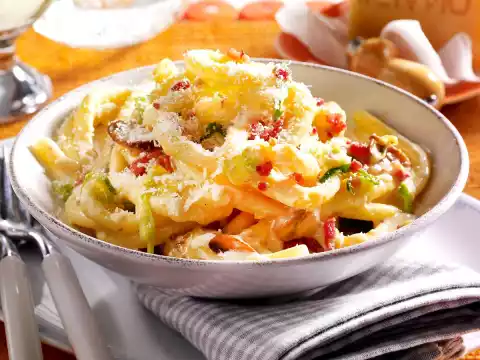 Cook the pasta in boiling salted water according to the instructions on the packet. Heat the oil in a large pan. Fry the bacon in it. Fry mushrooms and leek for about 4 minutes.