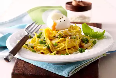 Bring plenty of salt water to the boil in a large pot. Boil the eggs in a second pot for about 6 minutes until soft. Cook the pasta in boiling salted water according to the instructions on the packet. Add peas and cook for about 2 minutes.