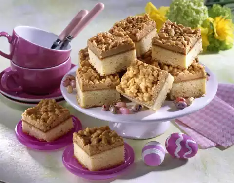 Turn the cake out of the tin onto a grid, remove paper. Let the cake cool down. In the meantime, melt peanut butter and 150 g couverture on a warm water bath. Stir in the Rice Krispies, put them on the cake, smooth them down and let them cool down. Cut into 5 x 5 cm cubes and arrange on a plate