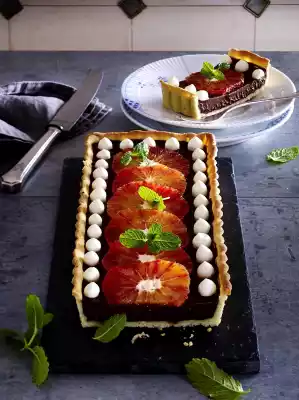 Pour into a piping bag with a small perforated spout and squirt as tuffs onto the chocolate cream at the edge of the tart. Place the orange slices overlapping in the middle of the tarte as strips. Decorate with mint.