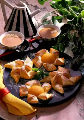 Place peaches in the middle of the circles and squares. Separate the egg. For the windmills, cut corners of the squares. Fold every other corner to the middle, spread with egg white and stick. Put them on a baking tray covered with baking paper.