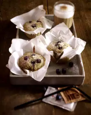 Tear parchment paper into 12 squares (each approx. 15 x 15 cm). Line recesses of a muffin tray (12 recesses) with parchment. Spread the dough evenly. Bake in the preheated oven (electric cooker: 175 °C/ convection oven: 150 °C/ gas: level 2) on the middle shelf for 20-25 minutes, remove. Take the muffins out of the tins and let them cool on a cake rack. Dust the muffins with icing sugar