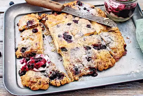 Take out and let it cool down a little. Whip 200 g cream until stiff, mix lightly with compote. Dust biscuits with icing sugar and serve lukewarm with cream-blueberry compote.