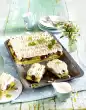 Take the cake out of the oven. After about 10 minutes, carefully turn out of the tin and let it cool down on a cake rack. Whip butter with icing sugar until white-creamy. Colour blue with food colouring. Spread the cake loosely with the butter cream and sprinkle with coconut flakes. Chill for about 15 minutes and then serve