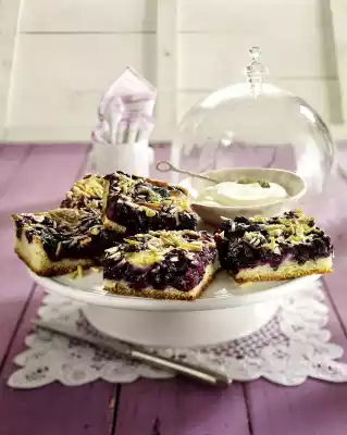 Cover and leave to rise in a warm place for 20-30 minutes. Select the blueberries, wash and drain well. Mix the sour cream, 4 eggs and 100 g sugar, stir in the pudding powder. Spread blueberries on the yeast dough and pour the sour cream vanilla icing over it. Sprinkle with almond slivers and 100 g sugar and spread 50 g fat in flakes on top. Bake in the preheated oven on the middle shelf (electric oven: 200 °C/ convection oven: 175 °C/ gas: level 3) for 35-40 minutes. Allow to cool on the fat pan