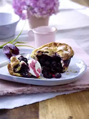 Sprinkle 1 teaspoon of breadcrumbs into each dough bowl. Spread blueberries on top. Whisk the egg. Brush the edges of the dough circles with egg yolk. Lay on the blueberries. Press the edge well. Brush with the rest of the egg and sprinkle with 2 tbsp. sugar.