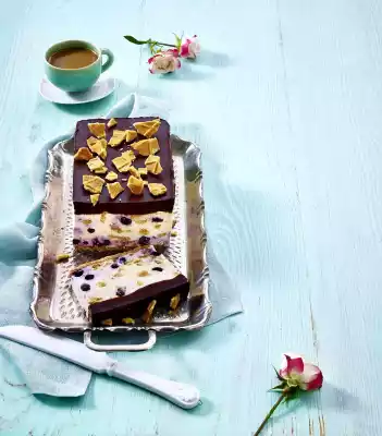 Place the blueberries in a bowl and allow to thaw. Rinse a box mould (11 x 25 cm; 1.25 litre capacity) with water and cover with foil. Cut 8 butter wafers to size and line the bottom of the mould with them.