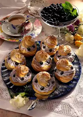 Pour cream into a piping bag with a star-shaped spout and squirt onto the lower halves of the cream puff. Sprinkle remaining blueberries on the cream. Place the lid on top. Dust the cream puffs with icing sugar and serve, possibly decorated with mint leaves.