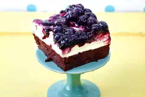 Remove the brownie from the mould, place the edge of the mould around the bottom again. Spread the cream on the bottom. Add blueberries, spread and chill for approx. 2 hours. Remove from the mould and cut into pieces.
