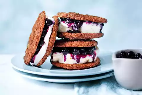 Warm the jam. Cut off the ice. Place on 4 biscuits. Put some warm jam on each. Cover with 4 biscuits and press on carefully.