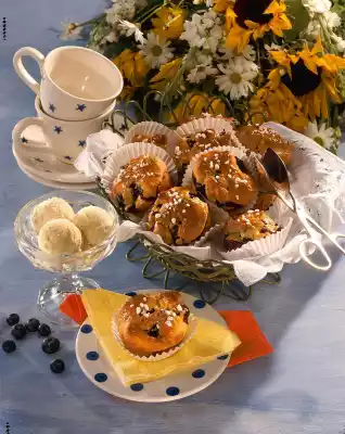 Select the blueberries, wash and drain well. Mix flour, salt, sugar, vanilla sugar and baking powder in a mixing bowl. Add the egg, yoghurt, milk, oil, cinnamon and nutmeg and work into a smooth dough with the dough hooks of the hand mixer. Carefully fold in blueberries. Grease well the recesses of a muffin tray (with 12 recesses of 7 cm Ø each) and fill each with 3/4 of the dough. Bake in a preheated oven (electric: 200 °C/ gas: level 3) for approx. 30 minutes until golden brown.
