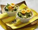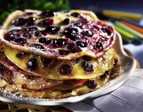 Mix flour and baking powder. Mix eggs, milk, flour and vanillin sugar to a smooth dough. Leave to swell for about 30 minutes. Sort blueberries, wash and drain.