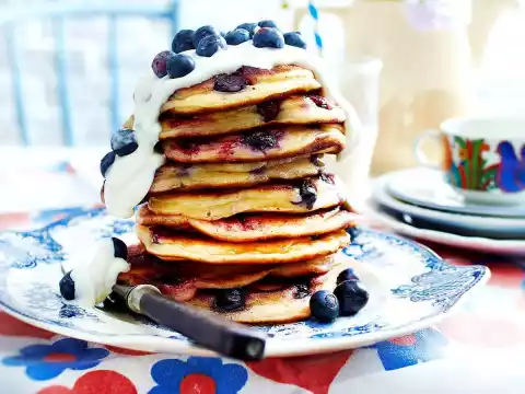 Put some vanilla sour cream and blueberries on the pancakes. Drizzle with maple syrup. Add the remaining vanilla sour cream and blueberries.