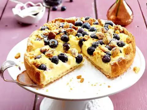 Let the blueberries thaw a little. Sprinkle the almonds over the cake base. Pour the pudding into the mould and spread the blueberries on top. Crumble the cantuccini and sprinkle over it. Dust with icing sugar.