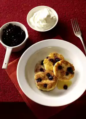 Heat 1/2 teaspoon fat in a frying pan. Put 4 heaped tablespoons into the pan, form into 1 round cake each. Spread about 5 blueberries on each cake. Fry on medium heat for 2-3 minutes on each side until golden brown.