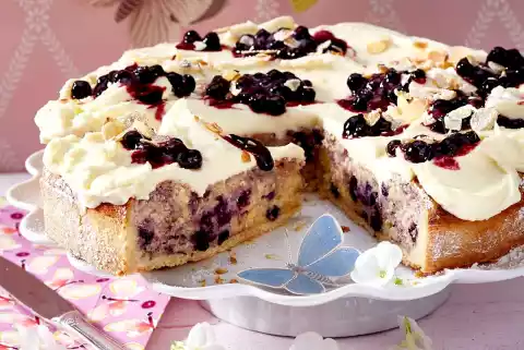 For the sponge mixture, whisk 250 g butter and 250 g sugar with the whisks of the mixer until creamy. Stir in 4 eggs individually. Mix 350 g flour and baking powder. Alternately stir in crème fraîche, lemon peel and lemon juice. Briefly fold in the floured blueberries. Spread the sponge mixture on the shortcrust pastry base and smooth it down.