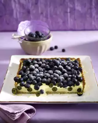 Line the tart mould with the pastry, press it on and cut off any protruding edges. Prick the base several times with a fork. Line with baking paper, fill with dried peas. Bake in the preheated oven (electric cooker: 200 °C/ convection oven: 175 °C/ gas: level 3) on the lower rack for approx. 20 minutes, remove dry peas and baking paper and continue baking for approx. 5 minutes. Let them cool down. Whip cream until stiff and fold loosely into the vanilla cream. Spread the cream on the tart, smooth it down and put it in a cool place for about 30 minutes. In the meantime, sort out the blueberries, wash and drain them well, if necessary put them on kitchen paper. Spread the blueberries on the cream. Keep cold until you eat. Dust with icing sugar before serving