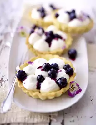 Cut the vanilla pod lengthwise and scrape out the vanilla pulp with the back of a knife. Add 125 g blueberries to the puree. Whip cream, vanilla pulp and 1-2 teaspoons of sugar until stiff, while letting the cream setting agent trickle in. Pour the cream into a piping bag with a medium perforated spout and squirt in small tuffs onto the tartelettes. Spread blueberries on top and decorate with violet blossoms