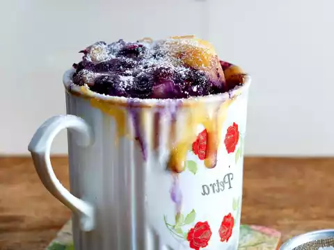 Mix flour, icing sugar, vanilla sugar, baking powder and salt in a greased cup. Add grated zest of organic lemon, egg, whole milk yoghurt and oil. Stir well with a fork. Fold in frozen blueberries.